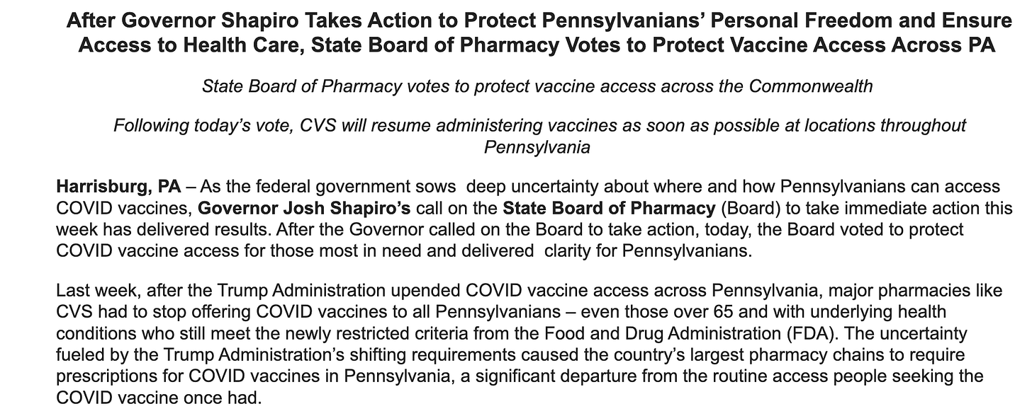 We should also share this information with members of Congress so they can put pressure on CVS and Walgreens to distribute them properly. The same is true of State leaders who are being asked to write unnecessary E.O.s or public health orders.