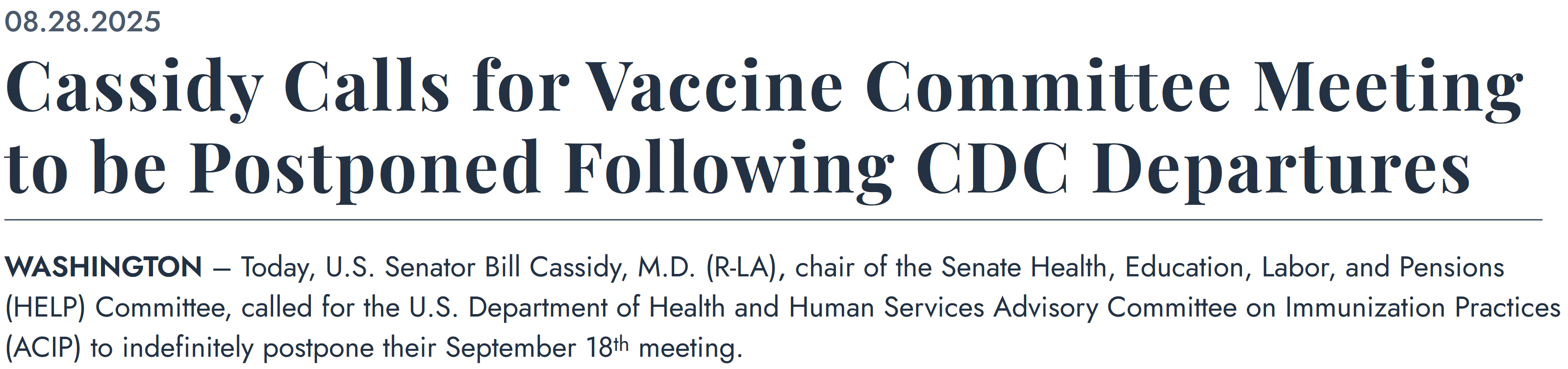 Make no mistake, ACIP is a hot mess with new members being appointed to drive around in that clown car in the last few days, with a meeting rapidly approaching in just a few weeks. Senator Cassidy is calling for this meeting to be postponed.